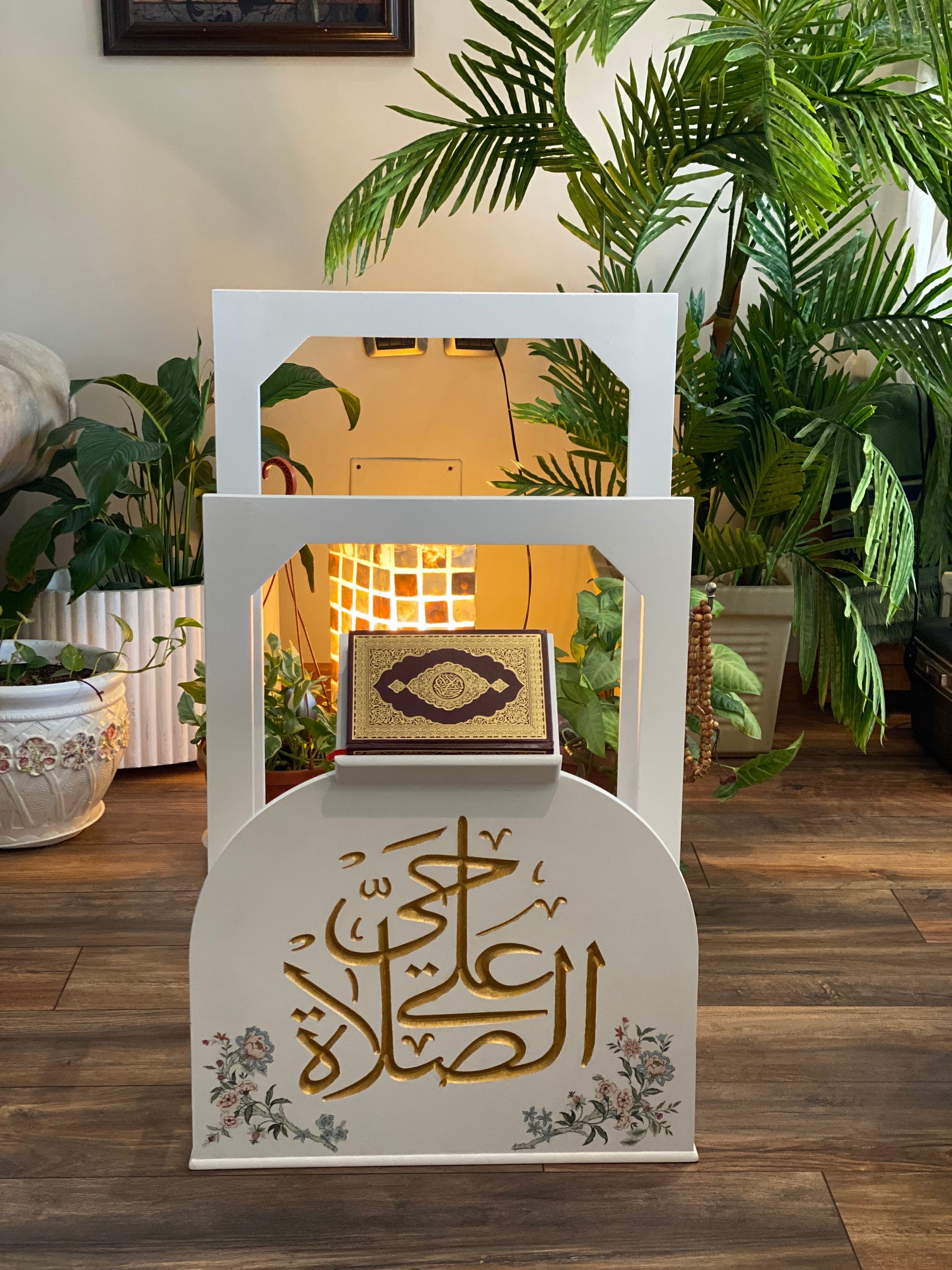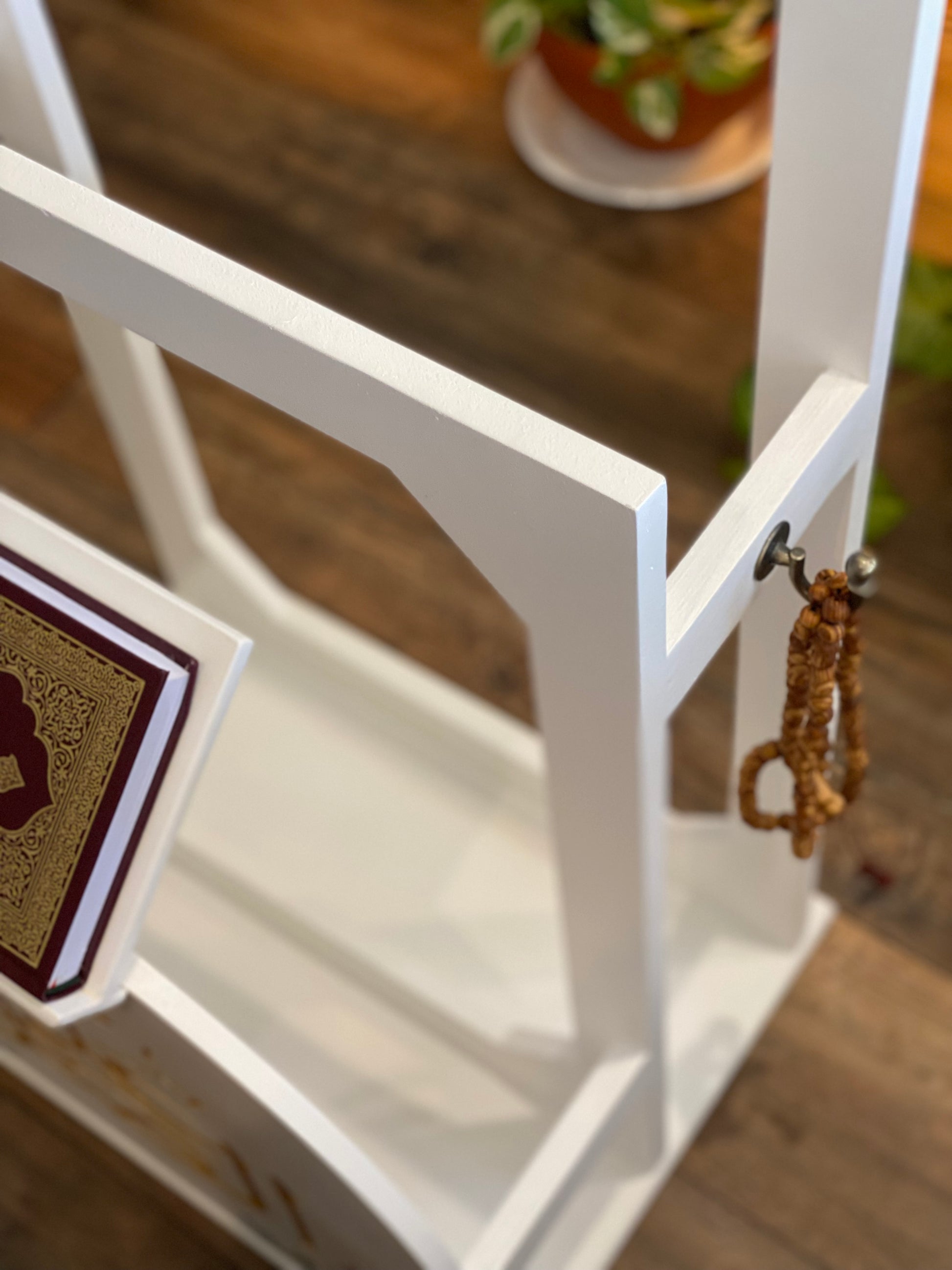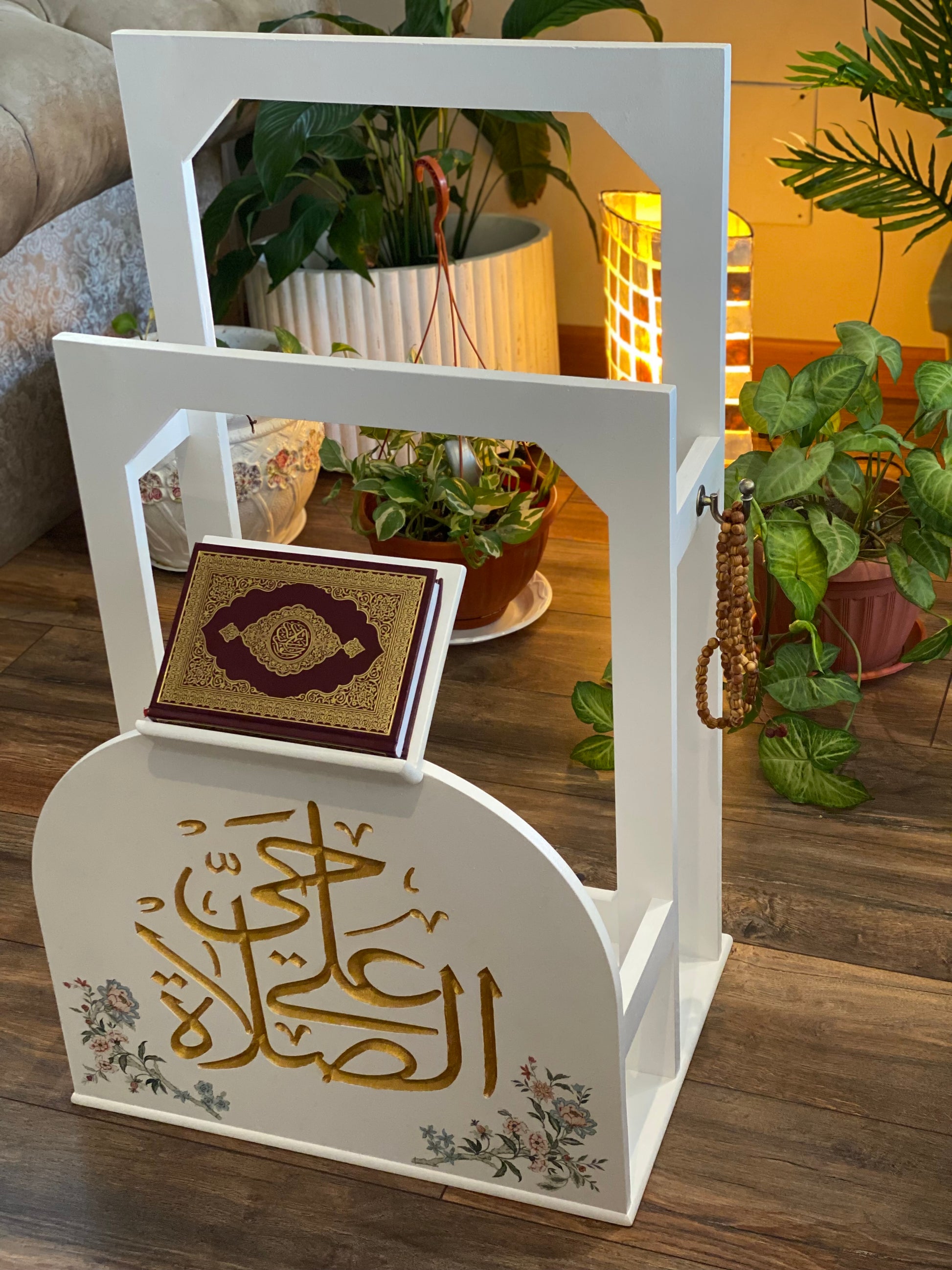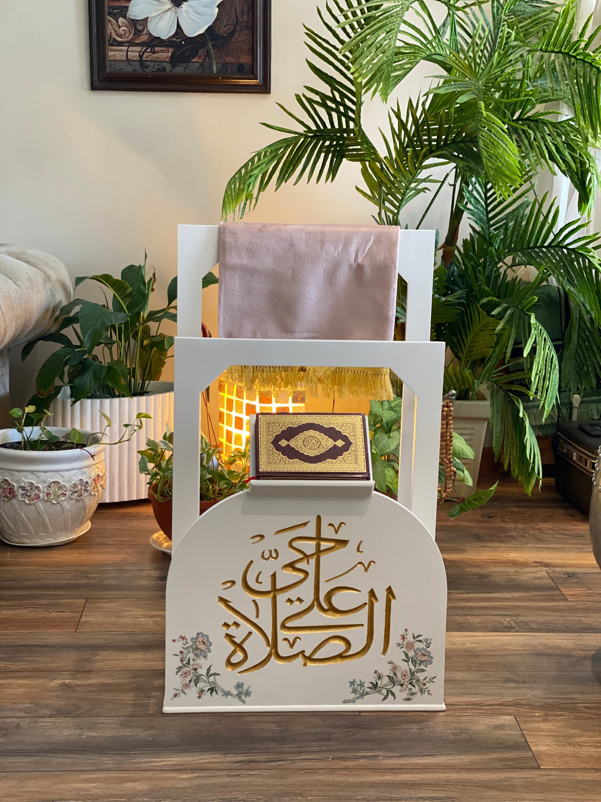 حامل سجاجيد صلاه ومصحف اوف وايت ورده روزالينا كلمه حي علي الصلاه بالدهبي مع عليقه سبحه