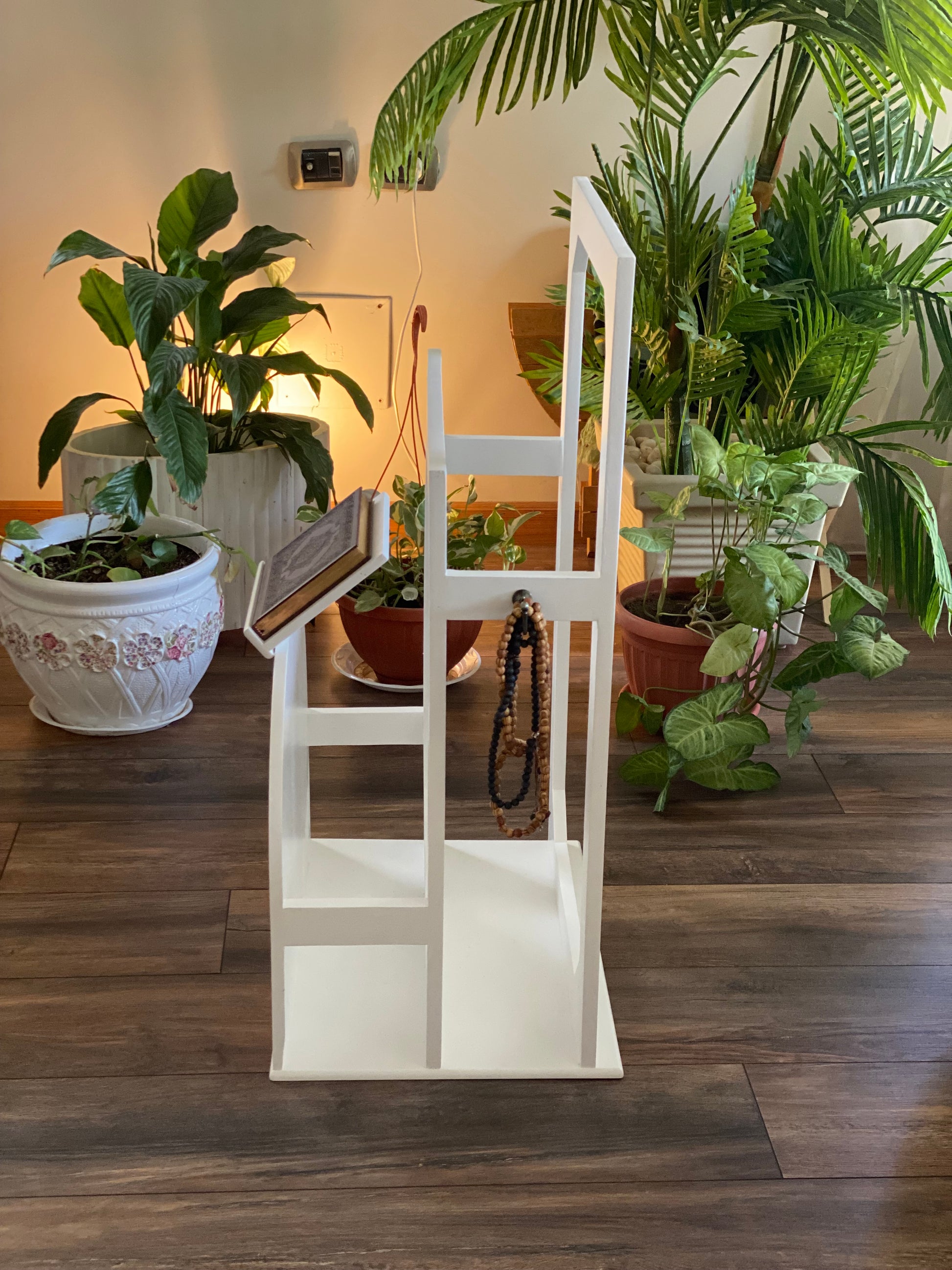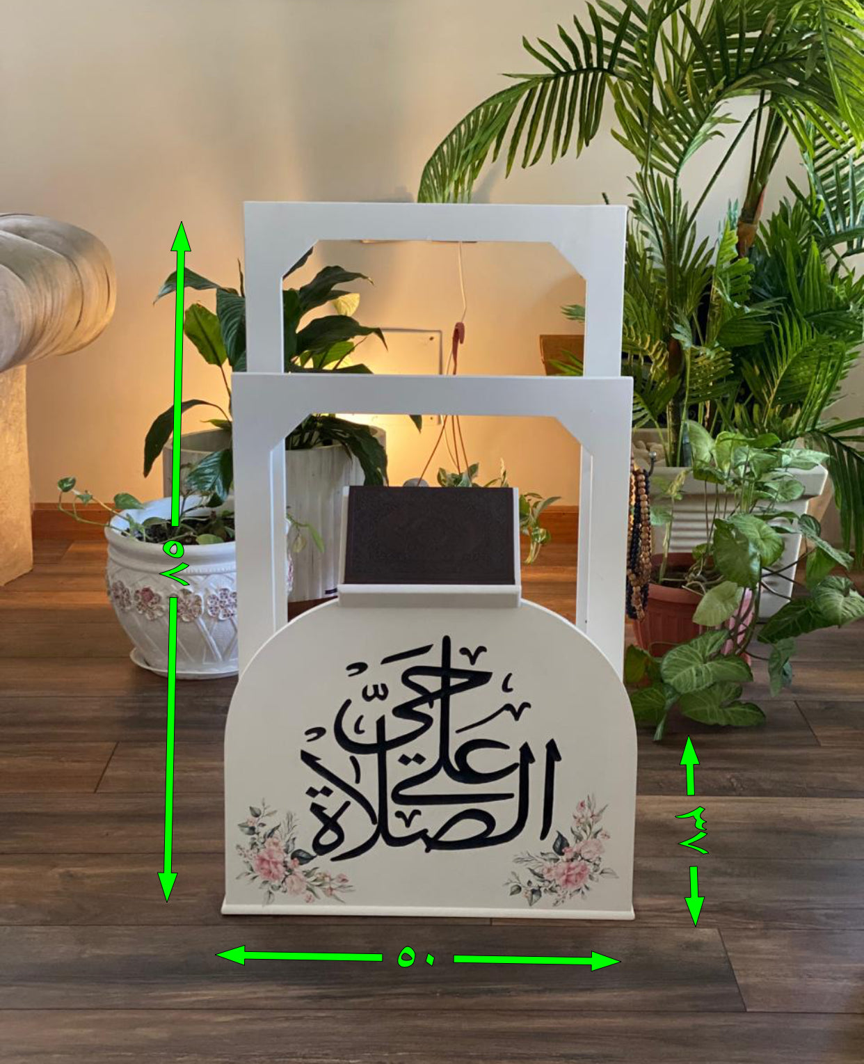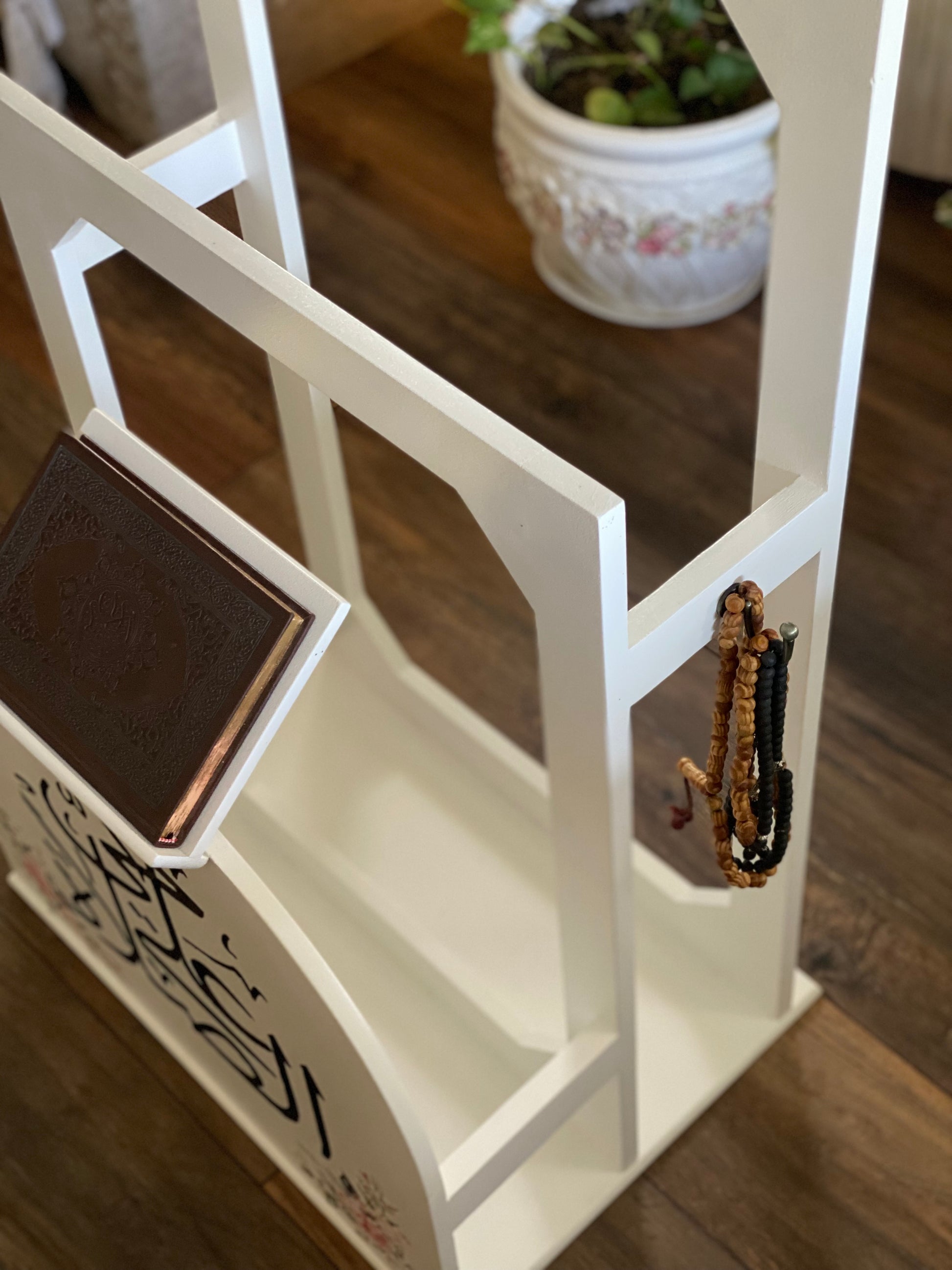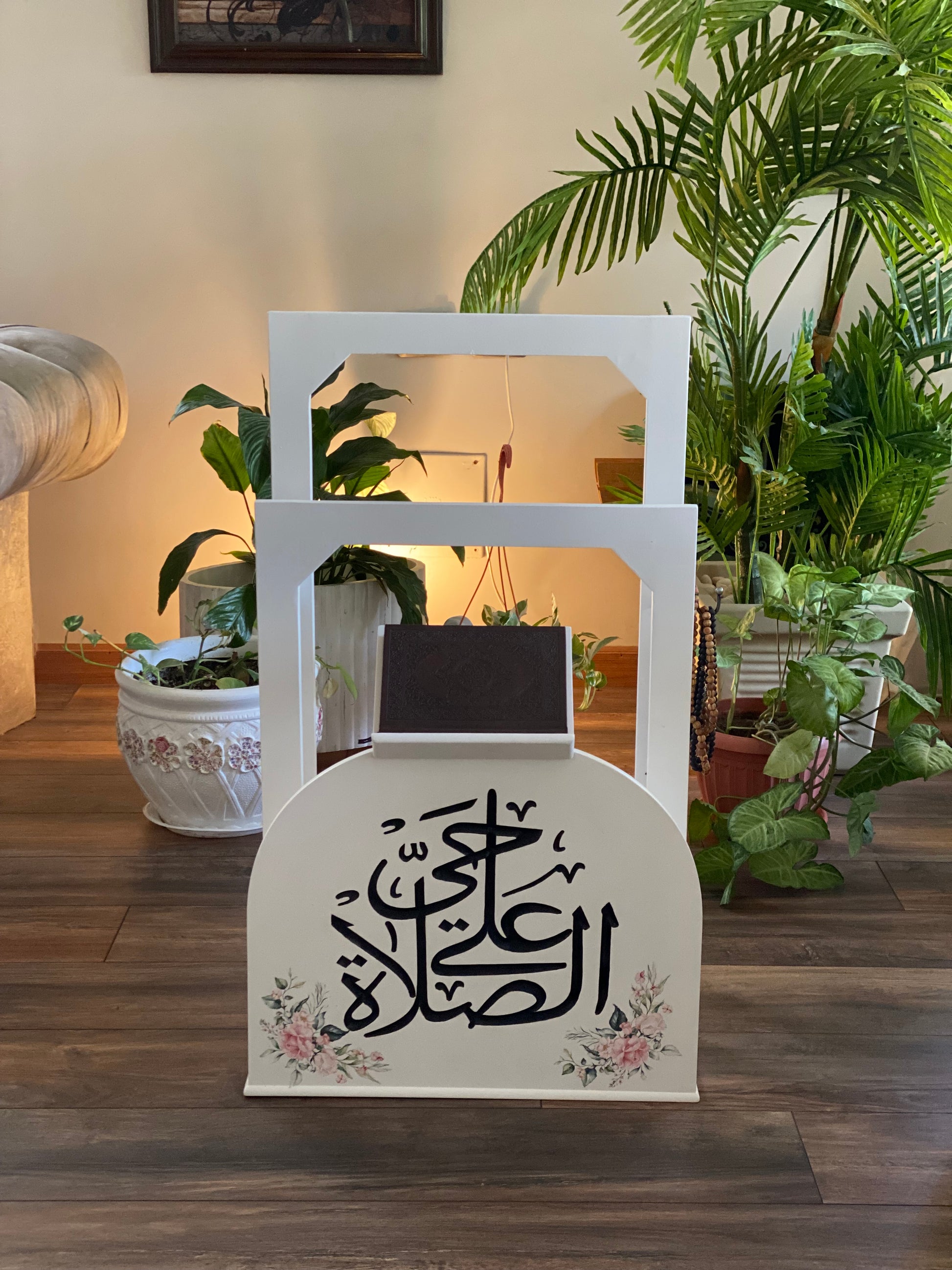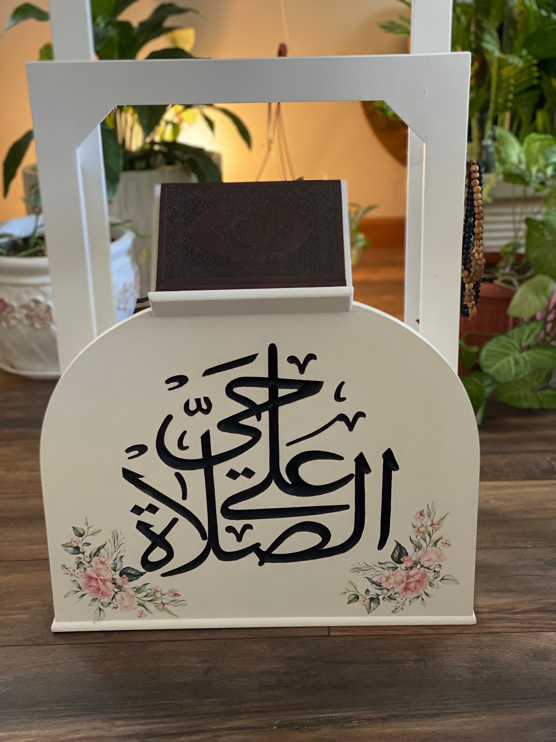 حامل سجاجيد صلاه ومصحف اوف وايت كلمه حي علي الصلاه اسود ورده ريحانه مع عليقه سبح